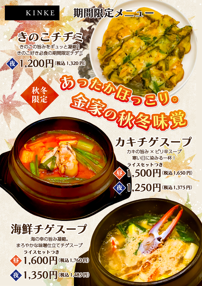 【期間限定】体の芯からあったまる!秋冬限定メニューが新登場! 【新商品・キャンペーン】2025/10/24 朝晩の冷え込みが少しずつ感じられる季節になりました。そんな時期にぴったりの、秋冬限定メニュー3品が新登場です! 🍲海鮮チゲスープ昼:1,600円(税込1,760円)夜:1,350円(税込1,485円)まろやかな味噌チゲスープに、ワタリガニと海鮮の旨みをたっぷり閉じ込めた贅沢な一杯。味噌ベースの深いコクと海の香りを存分に楽しめます。※ランチはライスセットがつきます※ランチ・ディナーで価格が異なります 🦪カキチゲスープ昼:1,500円(税込1,650円)夜:1,250円(税込1,375円)プリッとした大ぶりのカキを贅沢に使い、旨みを引き立てるピリ辛絶品スープ。食欲をそそる辛さとカキの濃厚な味わいをぜひご堪能ください。※ランチはライスセットがつきます※ランチ・ディナーで価格が異なります 🍄きのこチヂミ夜:1,200円(税込1,320円)まいたけをメインに、数種類のきのこをたっぷり使用。香ばしく焼き上げ、きのこの旨みをギュッと閉じ込めた秋の味覚たっぷりのチヂミです。きのこ好き必食の限定メニュー!※ディナー限定メニューです。 心も体もあったかほっこり温まる秋冬限定メニュー。この時期だけの味わいを、ぜひお楽しみください!皆さまのご来店を心よりお待ちしております。 Instagram Phone-alt Envelope Calendar-check 金家 -KINKE-🟠ランチ 11:00~14:00(L.O.13:30)🔵ディナー 17:00~23:00 (L.O. 22:30)〒182-0024東京都調布市布田1-26-12ダイアパレス調布 1階9号室🚃京王線調布駅東口から徒歩3分