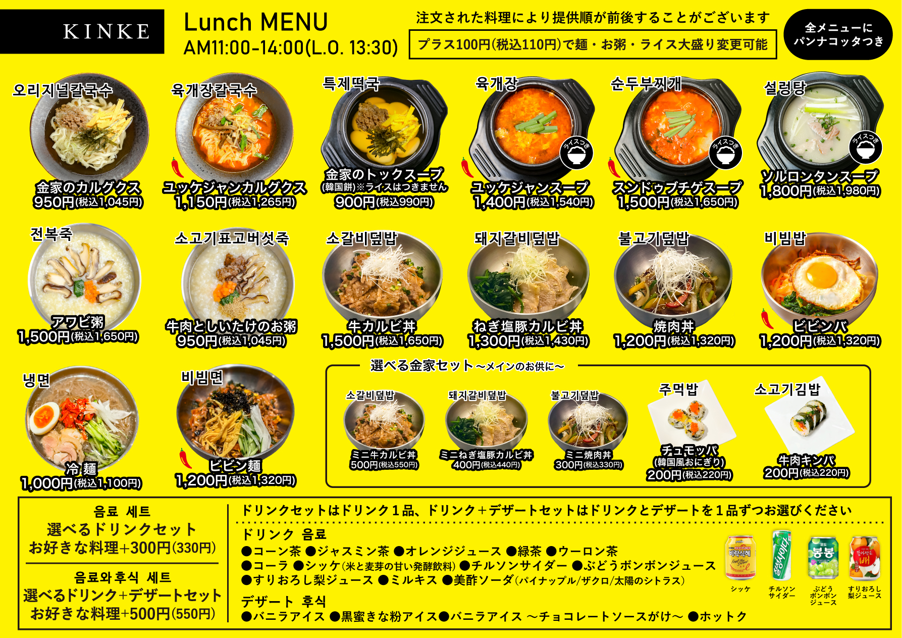 メニュー 朝メニュー 朝はお蕎麦・お粥をメインにご提供しております。 \当店オススメ/ 金家のトックスープ - 1,200円 韓国餅《トック》が入った鶏肉のうまみがきいたスープ \当店オススメ/ ソルロンタン - 1,200円 牛の肉・骨を長時間煮込んで作る乳白色のシンプルなスープ料理 和食 - Japanese food そば かけそば - 400円 冷または温 せいろそば - 500円 冷または温 たぬきそば - 430円 冷または温 とろろそば - 600円 冷または温 山菜そば- 500円 冷または温 月見そば- 650円 冷または温 にしんそば- 700円 冷または温 お粥 玉子粥 - 500円 付け合わせ2品 野菜粥 - 700円 付け合わせ2品 つけそば つけ汁そば - 700円 付け合わせ2品 ピリ辛温玉つけそば - 700円 ピリ辛がうまい! 朝定食 納豆定食 - 700円 納豆/おろし付厚焼き玉子/白飯/味噌汁/漬物 ベーコンエッグ定食 - 700円 ベーコン/目玉焼き/ミックスサラダ/白飯/味噌汁/漬物 ハムエッグ定食 - 700円 ハム/目玉焼き/ミックスサラダ/白飯/味噌汁/漬物 ウィンナーエッグ定食 - 700円 ウィンナー/目玉焼き/ミックスサラダ/白飯/味噌汁/漬物 とろろ定食 - 700円 とろろ/おろし付厚焼き玉子/白飯/味噌汁/漬物 単品 鶏唐揚げ(2個) - 150円 いなり寿司(2個) - 150円 トッピング:納豆 +100円 韓国料理 - Korean food トックスープ 鶏と玉子のトックスープ - 500円 豚肉のトックスープ - 500円 お粥 牛肉としいたけのお粥 - 700円 付け合わせ2品 キンパ キムチ - 700円 ピリ辛が美味! 牛肉 - 700円 ピリ辛が美味! スープ+ごはん テールスープとごはん - 700円 スンドゥブチゲスープとごはん - 700円 ユッケジャンスープとごはん - 700円 ランチメニュー カルグクス(韓国うどん)やスープ・お粥をメインにご提供しております。※全メニューに「パンナコッタ」がつきます \当店オリジナルうどんです/ 金家のカルグクス 950円 (税込1,045円) Wだしと自家製麺を使った新感覚韓国うどん。当店オリジナルメニューです! \旨辛モチモチがたまらない/ ユッケジャンカルグクス 1,150円(税込1,265円) モチモチ食感のカルグクス(韓国うどん)と旨辛スープの相性は抜群! \当店オススメ/ アワビ粥 1,500円(税込1,650円) アワビを贅沢に使った高級なお粥。肝を使っているので香ばしさと淡い苦みが特徴です。 【期間限定】秋冬メニュー 詳しくはこちら 海鮮チゲスープ ランチ:1,600円(税込1,760円) ディナー:1,350円(税込1,485円) ※ランチのみライスセットがつきます カキチゲスープ ランチ:1,500円(税込1,650円) ディナー:1,250円(税込1,375円) ※ランチのみライスセットがつきます 【ディナーのみ】きのこチヂミ ディナー:1,350円(税込1,485円) ※ディナー限定メニュー ※メニューをタップ(クリック)で拡大されます カルグクス(韓国うどん) [温]金家のカルグクス 950円(税込1,045円) [温]ユッケジャンカルグクス 1,150円(税込1,265円) +100円で麺を大盛りに変更できます スープ ライスセット(ライス・キムチ・ナムル)付き 金家のトック(韓国のお餅) ※ライスはつきません 900円(税込990円) ユッケジャン 1,400円(税込1,540円) スンドゥブチゲ 1,500円(税込1,650円) ソルロンタン 1,800円(税込1,980円) +100円でライスを大盛りに変更できます 韓国粥 ナムル盛り合わせ・トッピング韓国海苔付き アワビ粥 1,500円(税込1,650円) 牛肉としいたけのお粥 950円(税込1,045円) +100円でお粥を大盛りに変更できます 丼もの 牛カルビ丼 1,500円(税込1,650円) ねぎ塩豚カルビ丼 1,300円(税込1,430円) 焼肉丼 1,200円(税込1,320円) ビビンバ 1,200円(税込1,320円) 麺 冷麺 1,000円(税込1,110円) ビビン麺 1,200円(税込1,320円) 選べるセット 選べるドリンクセットお好きな料理 +300円(税込330円) コーン茶・ジャスミン茶・オレンジジュース・緑茶・ウーロン茶・コーラ・シッケ・チルソンサイダー・ぶどうボンボンジュース・すりおろし梨ジュース・ミルキス・美酢ソーダ(ザクロ/パイナップル/太陽のシトラス)からお好きなドリンクをお選びください 選べるドリンク+デザートセット お好きな料理+500円(税込550円) 上記ドリンクとデザートから1品ずつお選びください バニラアイス・黒蜜きな粉アイス・バニラアイス~チョコレートソースがけ~・ホットク 選べる金家セット ~メインのお供に~ ミニ牛カルビ丼 500円(税込550円) ミニねぎ塩豚カルビ丼 400円(税込440円) ミニ焼肉丼 300円(税込330円) チュモッパ(韓国風おにぎり) 200円 (税込220円) 牛肉キンパ 200円(税込220円) デザート バニラアイス 500円(税込550円) バニラアイス~チョコレートソースがけ~ 500円(税込550円) 黒蜜きな粉アイス 500円(税込550円) ホットク 600円(税込660円) グランドメニュー 夜は金家名物「タッカンマリ」をメインに韓国料理をご提供いたします。 \金家名物/ タッカンマリ1~2人前/1羽 6,000円(税込6,600円) 鶏を丸ごと煮込んだ鍋料理。お好みでカスタマイズできる特製タレにつけてお召し上がりください! ポッサム(茹で厚切り豚肉) 2,000円(税込2,200円) やわらかく茹でた豚肉をエゴマの葉などで包み、特製タレで食べる絶品料理 ケランチム 1,200円(税込1,320円) 卵をスフレ状にして蒸した韓国料理。独特のあつあつふ